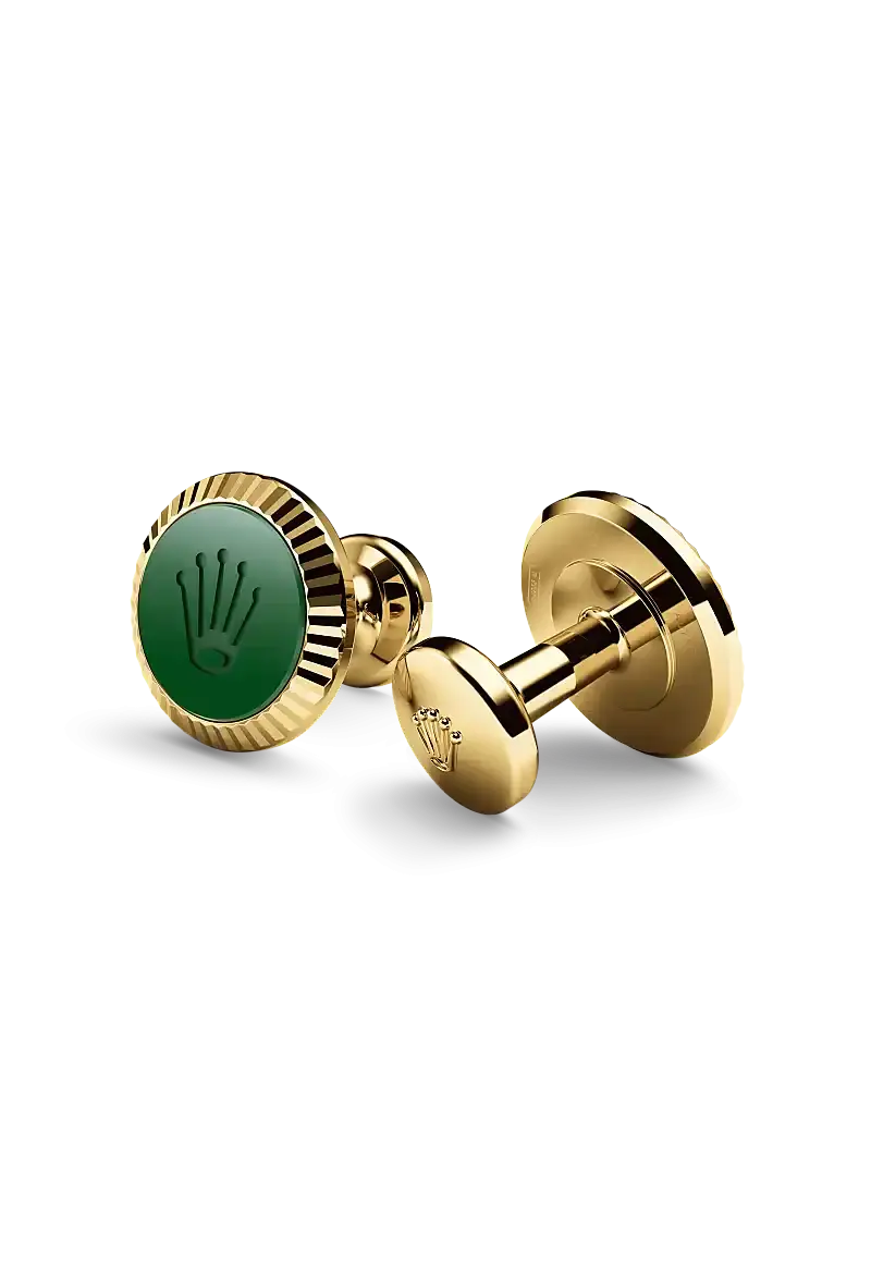 這款勞力士袖扣以18K黃金打造,搭配經典勞力士三角坑紋、Cerachrom飾面及勞力士皇冠標誌。